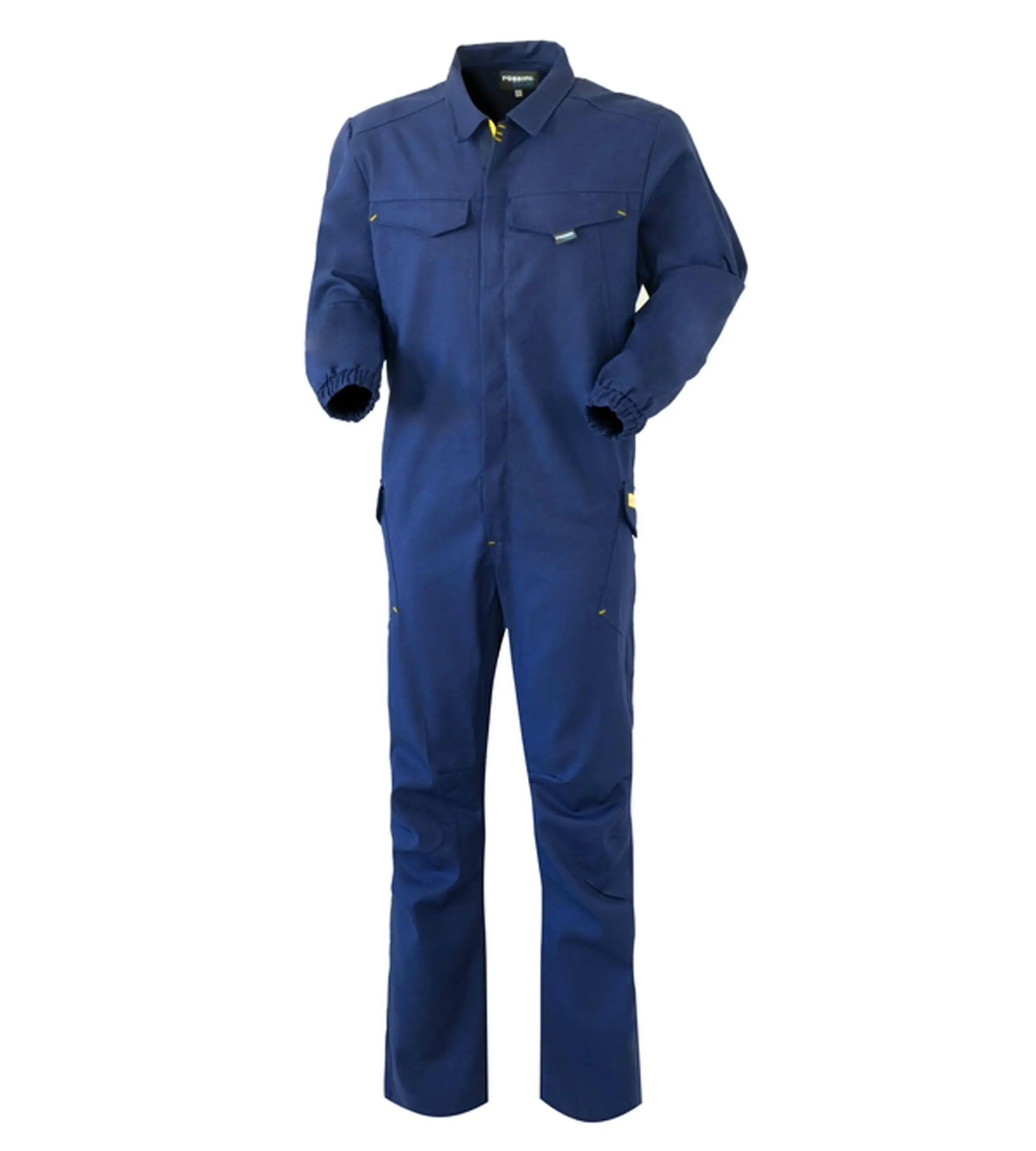 Tuta da lavoro con chiusura centrale con zip a doppio cursore coperta da patella chiusa con punti velcro.