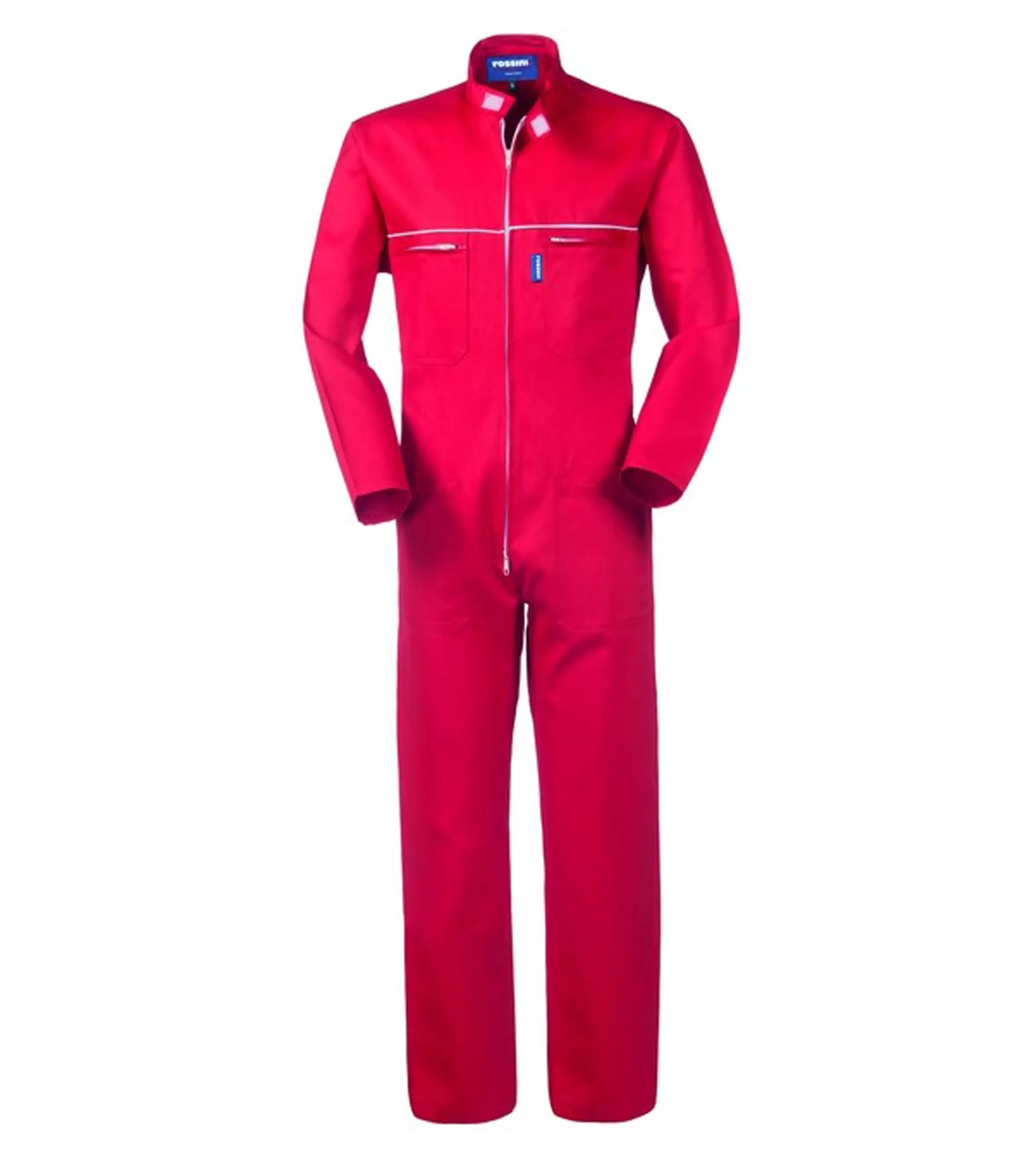 Tuta da lavoro con chiusura centrale con zip a doppio cursore coperta da patella, collo alla coreana chiuso con velcro, coda di topo di colore bianco al petto.