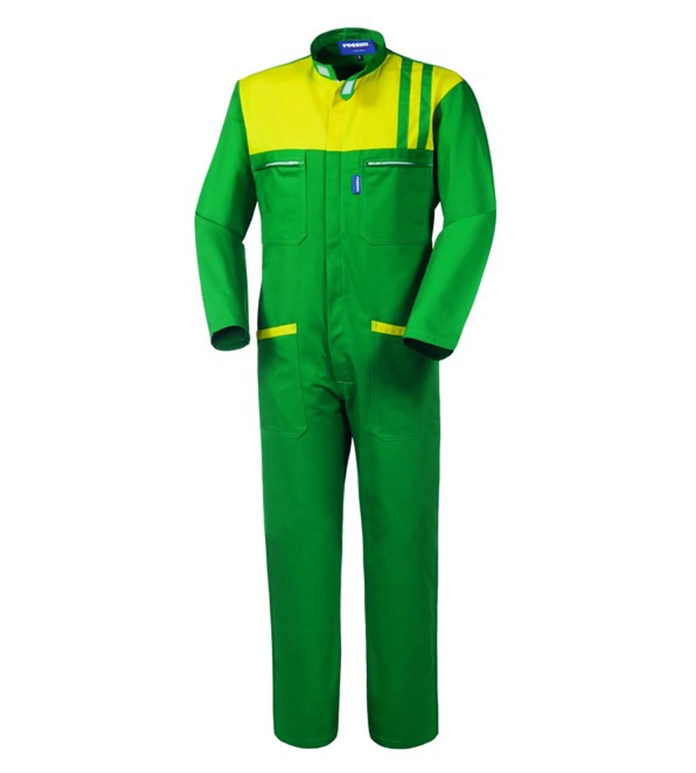 Tuta da lavoro con chiusura centrale con zip a doppio cursore coperta da patella, carré anteriore e profili su tasche di colore giallo, collo alla coreana chiuso con velcro.