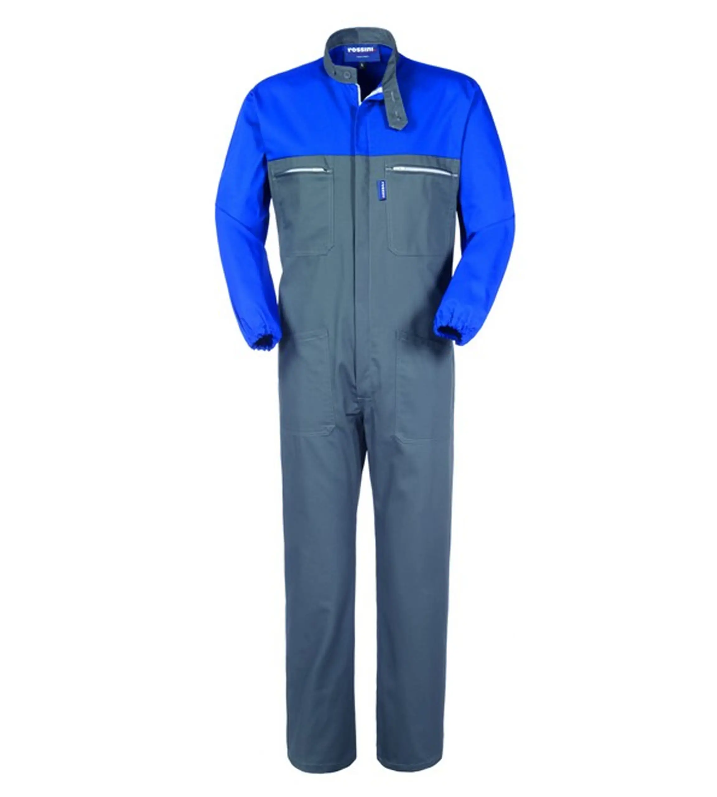 Tuta da lavoro con chiusura con cerniera centrale coperta, carré anteriore e posteriore e maniche di colore a contrasto, collo alla coreana chiuso con due bottoni.