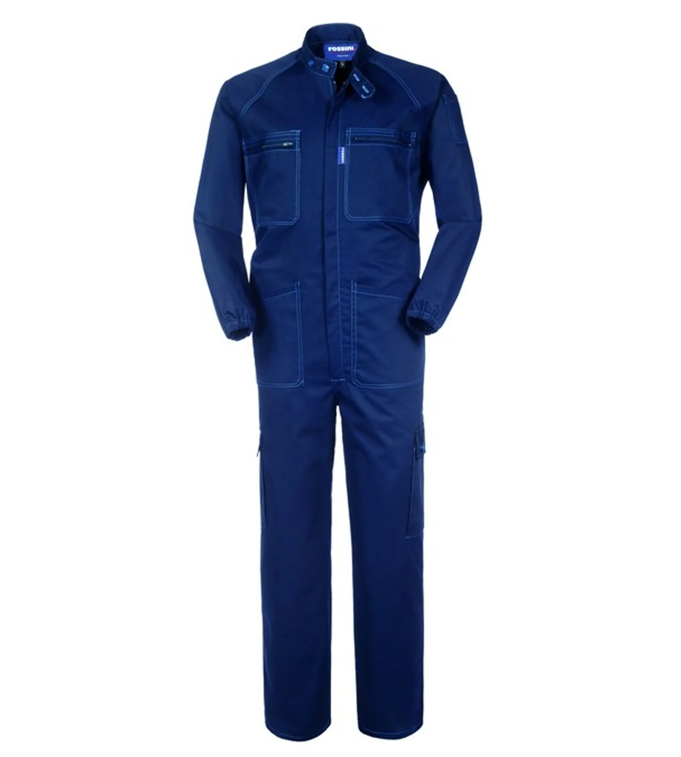 Tuta da lavoro con chiusura centrale con zip a doppio cursore coperta da patella, maniche raglan, collo alla coreana chiuso con due bottoni azzurri.