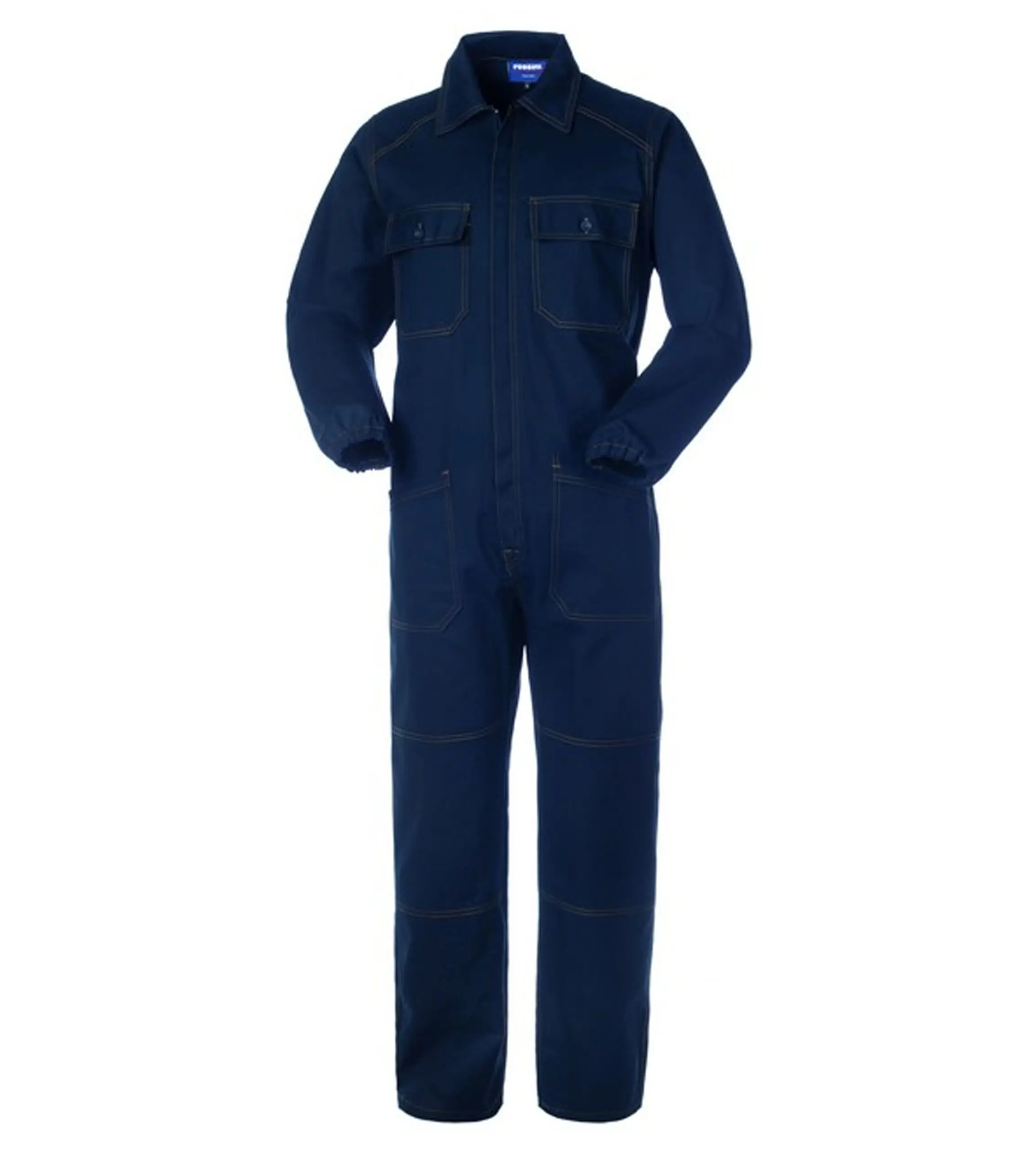 Tuta da lavoro in cotone twill elasticizzato, con elastico in vita posteriore e chiusura centrale con zip a doppio cursore coperta da patella.