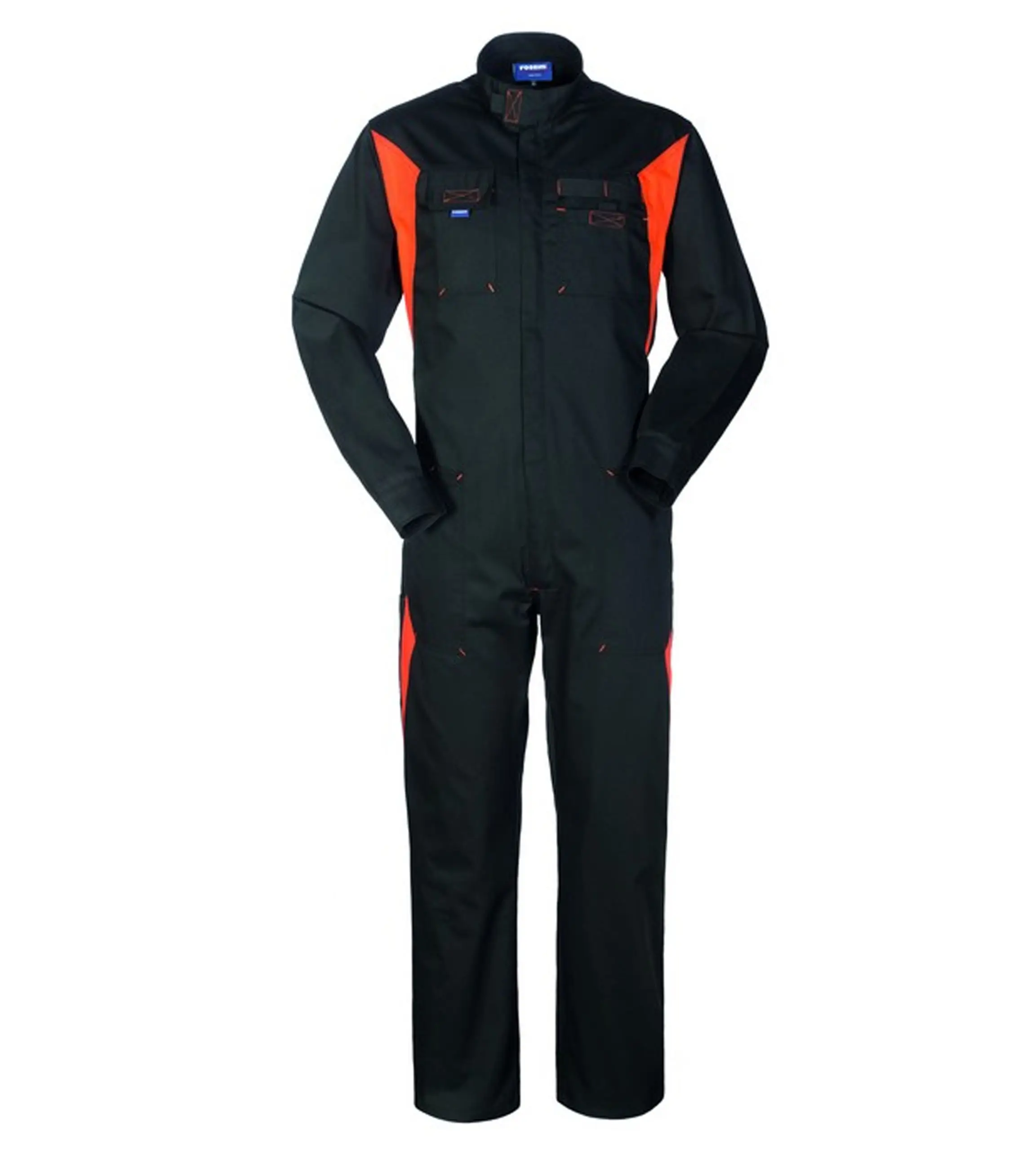 Tuta da lavoro con collo alla coreana chiuso con velcro, chiusura centrale con zip a doppio cursore coperta da patella.